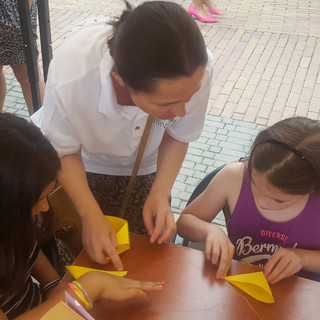Őszintén szólva, magunk is meglepődtünk, milyen sok apróság érdeklődött a színes, papírfigurás könyvjelzők készítésének csínja-bínja iránt, de nagy öröm volt a csemeték körül sürgölődni. (Igaz – ahogy a fényképeken is látszik – mi magunk is jól szórakoztunk a hajtogatás, vágás, színezés, ragasztás közben. El is készült számtalan hercegnős, békás, pandás, mignonos könyvjelző, amiket a gyerkőcök nagy örömmel vittek haza.